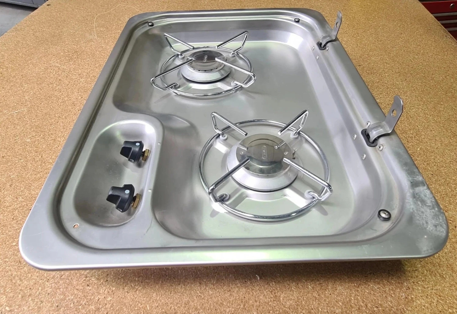 The Dometic CRAMER 2 burner hob features an integrated heat-resistant safety glass lid, detachable chromed pan supports, stainless steel burner caps, recessed controls and a low profile rubber seal.
