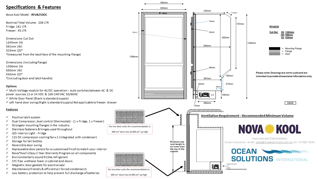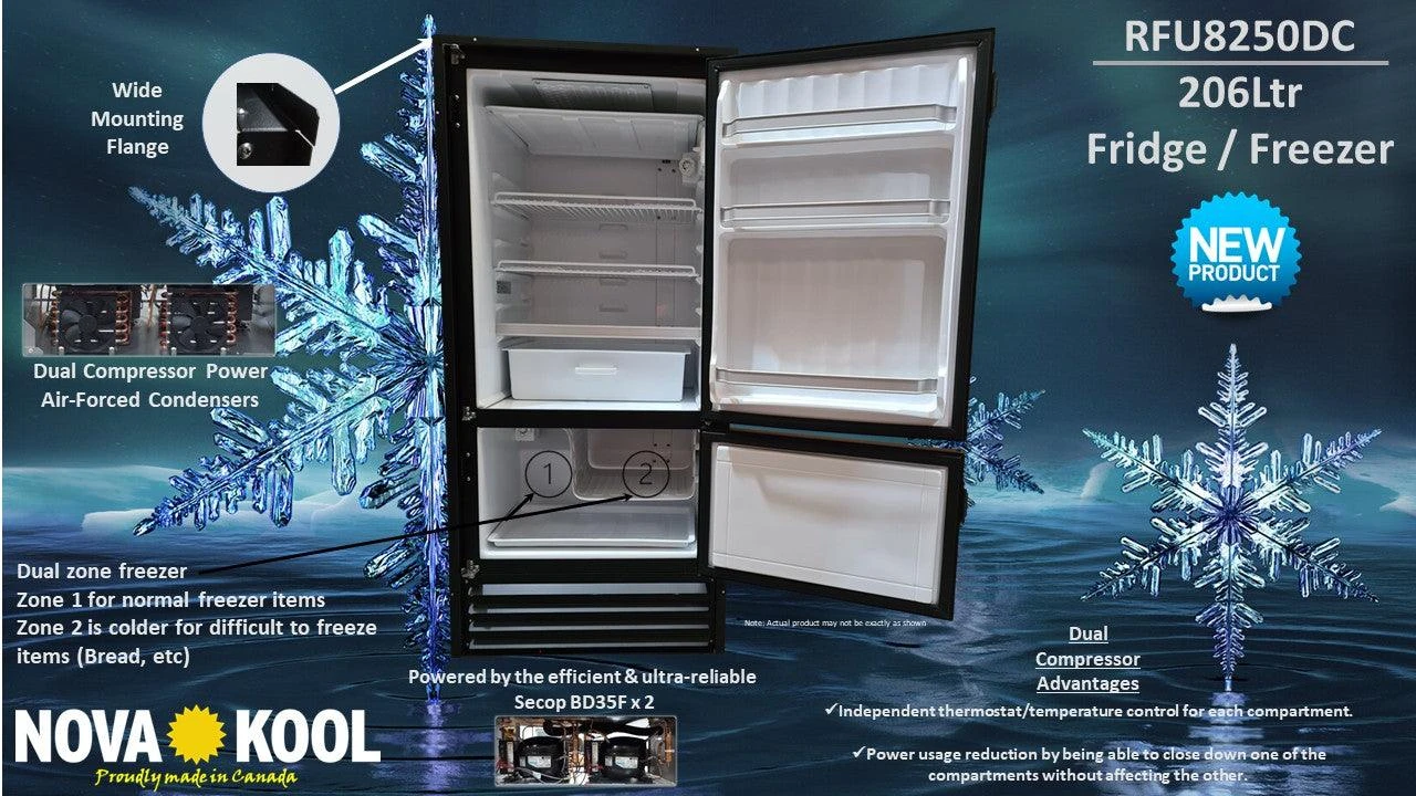 The RFU8250 is equipped with 2 highly efficient variable speed Danfoss BD35F compressor (fan included) that is designed for use in boats, caravans and RV’s running 12 and 24 volts DC.